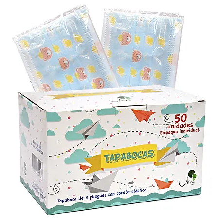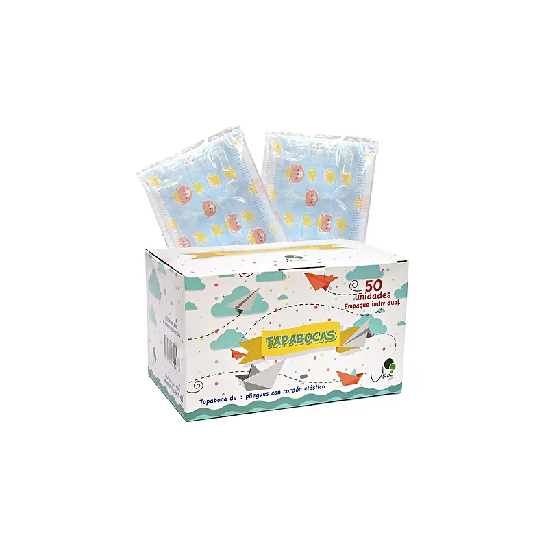Mascarilla facial o Tapabocas desechable termosellado por ultrasonido, de 3 capas con sujeción a la oreja mediante elásticos de alta suavidad, clip nasal metálico integrado de ajuste al contorno. Con capa exterior en colores infantiles y azul. Troquelado con marca y registro Invima para garantizar la autenticidad. Display de 50 tapabocas con empaque individual.